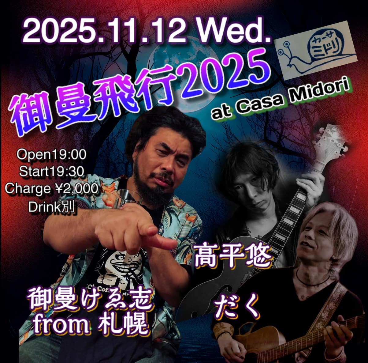 御曼飛行2025~4日目御曼けゑ志~official blog11月12日渋川 Casa Midori【時間】open 19:00/start 19:30【料金】¥2,000 + 1drink【出演】高平悠/だく/御曼けゑ志 share share投稿日時: 2025年11月07日 03:53