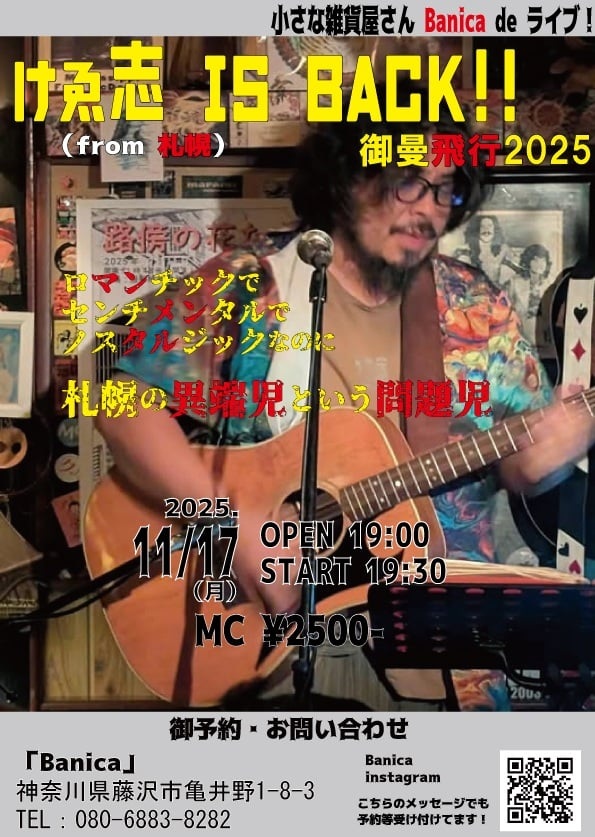御曼飛行2025~9日目御曼けゑ志~official blog11月17日六会日大前 B anica【時間】open 19:00/start 19:30【料金】¥2,500 + 1drink【出演】御曼けゑ志 share share投稿日時: 2025年11月07日 03:54