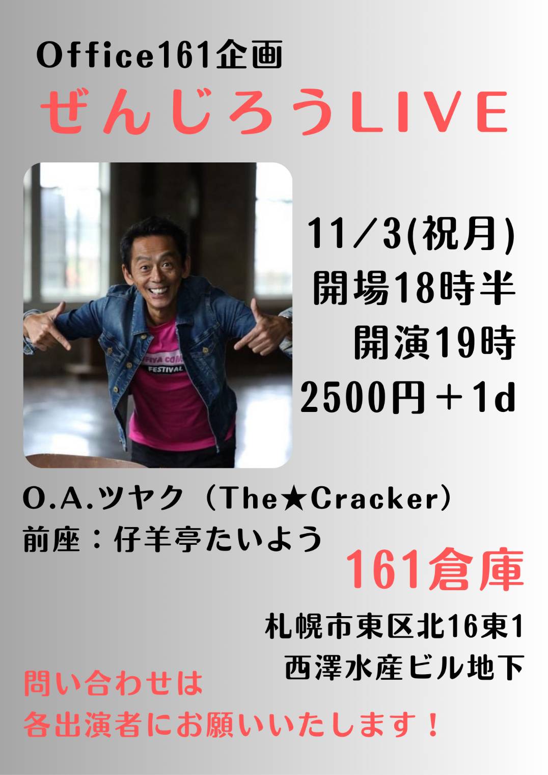 Office161企画「ぜんじろうLIVE」スケジュール日時:2025年11月3日(月・祝)open 18:30/start 19:00¥2,500(1D)出演:ぜんじろうOpenning Act:ツヤク(The★Cracker)前座:仔羊亭たいよう share share投稿日時: 2025年09月14日 13:08