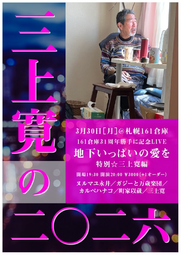 161倉庫31周年勝手に記念LIVE 「地下いっぱいの愛を 特別☆三上寛編」スケジュール日時:2026年3月30日(月)open 19:30/start 20:00¥3,000(別途・1Dオーダー)出演:ヌルマユ永井ガジーと万歳楽団カルベハナコ町家以蔵三上寛 share share投稿日時: 2026年02月26日 14:12